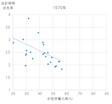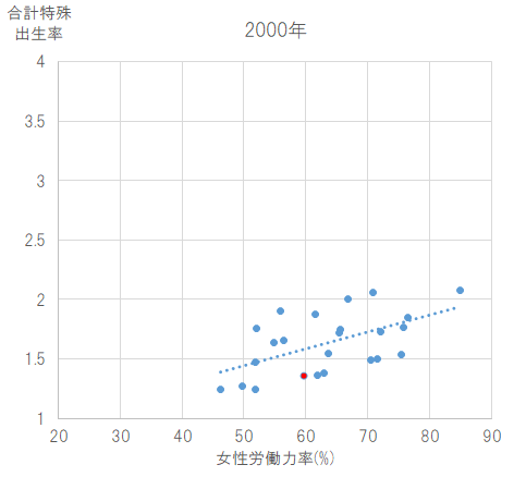 いかがでしょうか。「女性の労働力率が高くなることと出生率が低下する」という(負の)相関は、1970年では成立しているようですが、2000年では労働力率も出生率も高くなるという正の相関がみられます。子育てしていても働きやすい環境が整備されると、労働力率と出生率の双方が高まるのではないか、といえそうです。